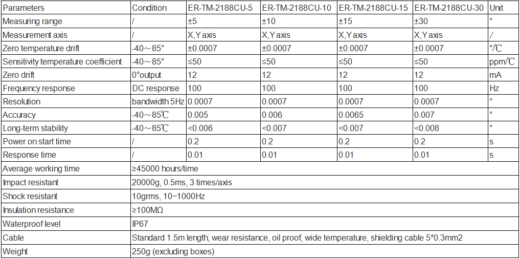 It is a standard industrial high-precision current output single-axis tilt sensor, with standard currents of 4-20mA, 0-20mA, 0-24mA to choose, and RS232 output, which can transmit 2000 meters away. Users only need to collect the sensor voltage value and can calculate the current object tilt angle. The built-in (MEMS) solid pendulum, by measuring changes in the static gravitational field, translates into changes in inclination.