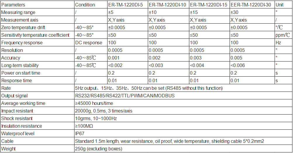 It is a full temperature compensation high-precision two-axis tilt sensor with a resolution of 0.0005°, an accuracy of 0.001°, and a temperature drift of 0.0005°/℃. The output interface has RS232, RS485, RS422, TTL, Modbus to choose from.