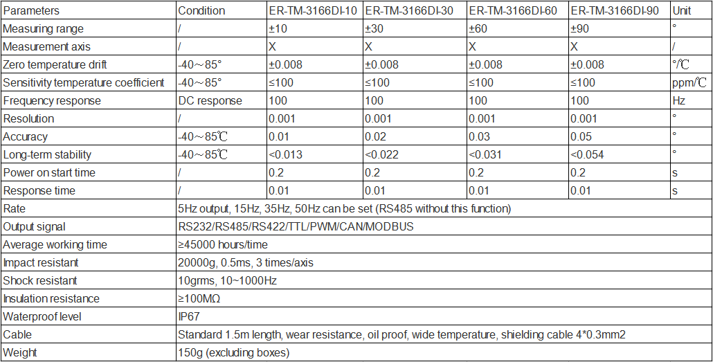 AND-TS-3166DI Digital Single Axis Tilt Meter is designed for industrial field control field. It has a built-in high-precision 16bit A/D converter and an N-order filtering algorithm to measure the tilt and pitching angle of the sensor output relative to the horizontal plane. The output interfaces RS232, RS485, RS422, TTL, PWM, CAN, MODBUS bus are available for selection.